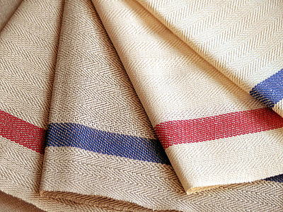 一見、よくある無地にストライプのフラットタオルですが、無地部分は美しいツイル織の、とてもお洒落なデザインです。しっかりとした厚みがありますが、とてもしなやかで優しい手触りなのでとても使いやすいタオルです。麻(亜麻)50%綿50%