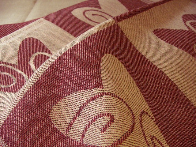 深い色合いが落ち着いた印象のクロス。ハートのモチーフがとてもお洒落で、プレースマットとして使うのもお勧めです。