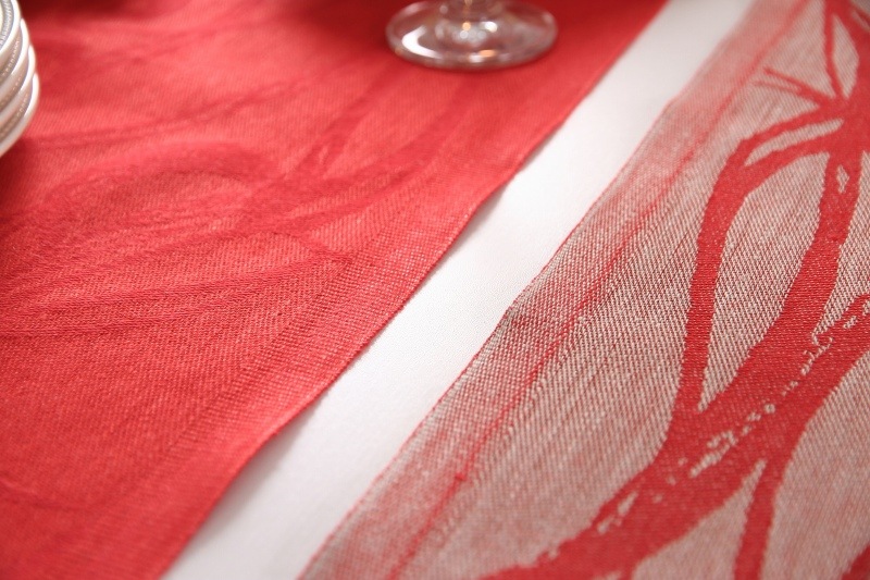 経糸に亜麻色の糸、横糸に色糸を組み合わせたジャガード織のクロスです。和、洋、どちらのインテリアにもしっくりきますね。リネンの凹凸に当たる光の種類によって様々な表情が楽しめる上質なテーブルランナーです。