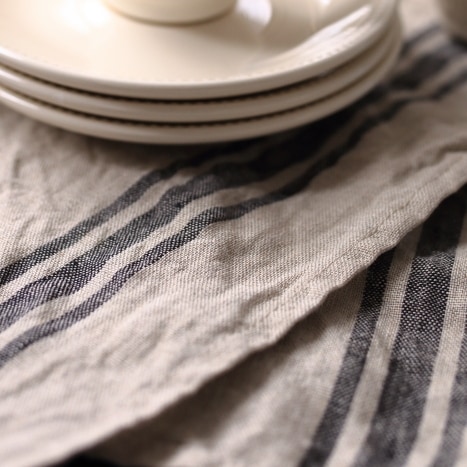 ナチュラルカラーの亜麻リネンクロスに、カラーラインの入ったトラディショナルなデザインのクロスです。人気の「カルボ」と同じ糸で織られた生地を使用していますので、吸水力と乾きやすさは抜群。
